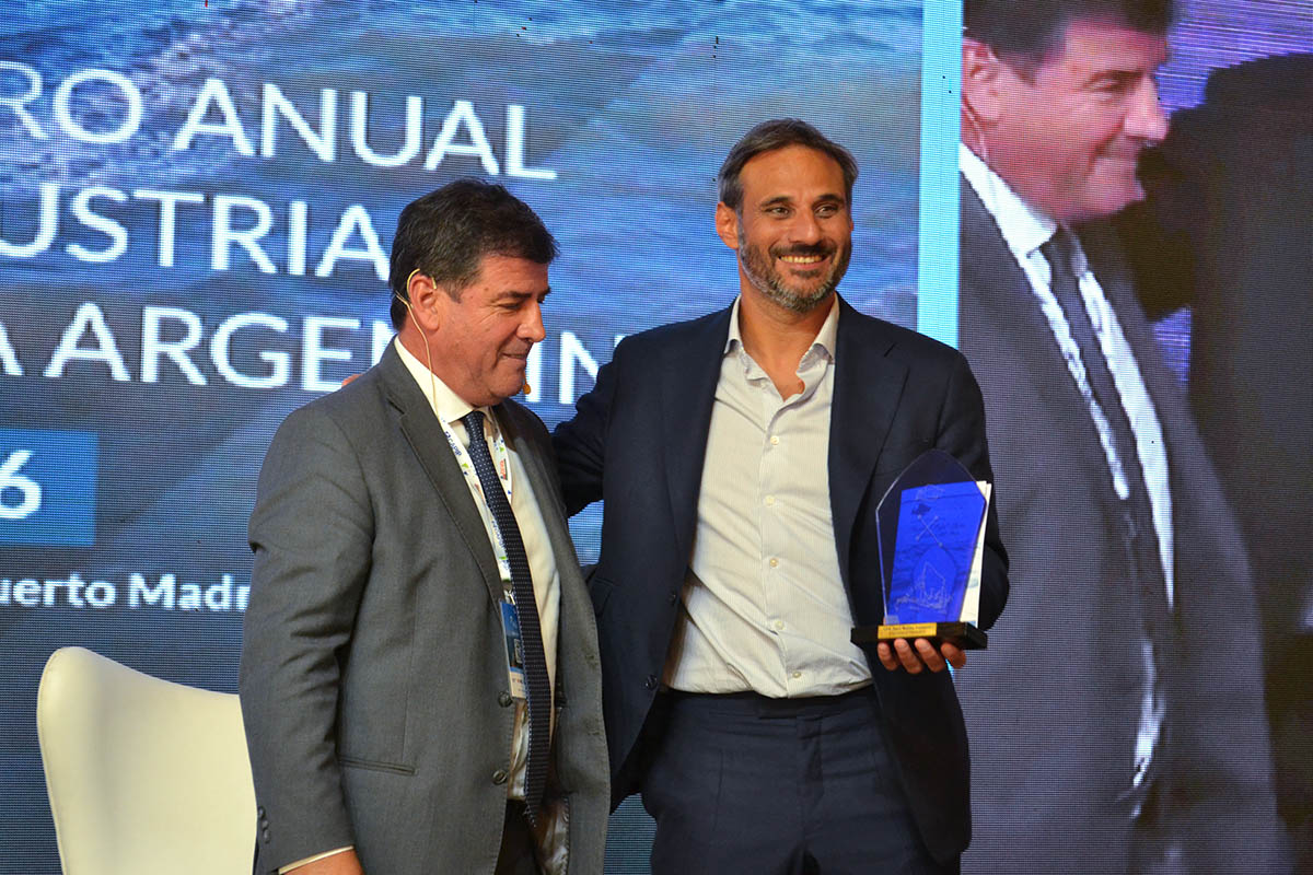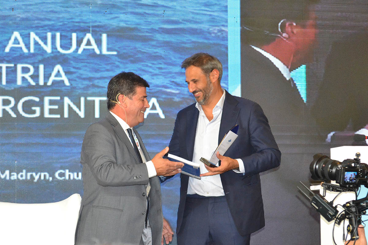 En el escenario del Foro PescAR, el capitán Jorge Frías hizo entrega de la distinción "Nicolás 'Popa' Asaro, Caballero del Mar" al empresario pesquero Raúl Matías 'Tato' Cereseto, por su destacada participación y sostenida labor en la difusión de la industria pesquera, visibilizando a los sectores y personas que la integran.