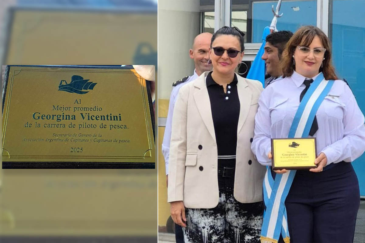 La Cap. Susana Benitez entregó la placa “al mejor promedio de la carrera Piloto de Pesca” a Georgina Vicentini. Acompañadas por cra. asociada cap. Ivana Carabajal, la marinera y estudiante de Piloto de Pesca Rosana Mencia, y la enfermera naval del “Angelescu” Inés Álvarez, compartieron este histórico momento, pues es la primera vez que una mujer obtiene el mejor promedio.